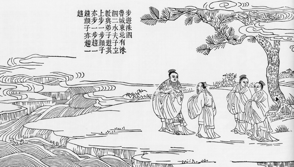 There were the River Zhu and Si wandering outside northeastern of the capital of Lu state. Confucius often taught his disciples along banks of the two rivers. When Confucius took one step, his disciple Yan Hui followed his footsteps and took one step. When Confucius took a quick step, Yan Hui also took a quick step.
