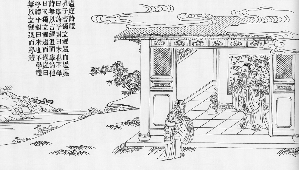 One day, Confucius stood alone in the courtyard and saw his son Kong Li walking respectfully with hasty steps. He called him and asked, "Have you learned The Book of Songs?" Kong Li replied, "Not yet." Confucius then said, "If you don't learn The Book of Songs, you can't talk with others properly." So Kong Li went back to learn The Book of Songs seriously. A few days later, when Kong Li passed the courtyard, he was again stopped by Confucius and asked, "Have you learned The Book of Rites?" Kong Li replied, "Not yet." Confucius said, "If you don't learn The Book of Rites, your character cannot be established." So Kong Li went back to learn The Book of Rites.