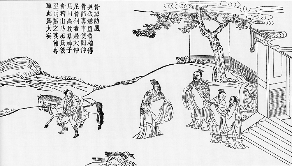 Wu state attacked and occupied Kuaiji, the capital of Yue state, and got a bone as long as a cart. Wu state sent messengers to consult Confucius on it, "What animal has such a big bone?" Confucius said, "I heard that after Da Yu (the third of the three legendary emperors who created the Chinese state) controlled the flood successfully, he called a group of gods to Mount Kuaiji for celebrating the success. The giant Fangfeng was late and beheaded by Da Yu. A bone of him was as long as a cart, which was also the biggest bone in the world. This must be his bone."