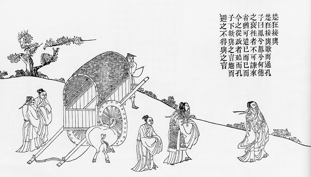 In the 9th year of the reign of Duke Ai of Lu state (486 BC), students who was in office in Wei state said that the new duke of Wei meant to put Confucius in an important position. So Confucius decided to return from Chu to Wei. Before Confucius set out on his way, a recluse of Chu named Jieyu came to Confucius' carriage as if he wanted to see him off. He sang beside the carriage, "Oh Phoenix! Why a virtuous being like you came to this decaying country? As to the future, you can't expect. As to the past, you can't regret. When the world is in order, the sage will achieve his career; when the monarch is fatuous and the world is in chaos, even the sage has to follow the trend to survive. At this time, we can only expect to be free from torture. Happiness is lighter than feathers, but I don't know how to gain it; the disaster is heavier than the earth, but I don't know how to avoid it. Give up your vain pursuit! Don't publicize your virtue in front of people! Pay attention to the danger around you! It's not wise to artificially break a path for people to follow! Thorns are everywhere, and I don't want to be hindered in walking! Roads are winding, and I don't want my feet to be hurt!" Hearing the song, Confucius wanted to get off the carriage and talk to Jieyu. But Jieyu quickly walked away.