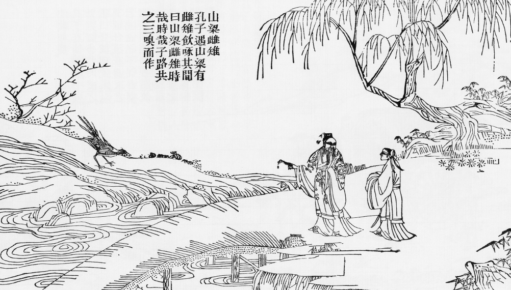 When Confucius was in Wei state, one day he went out with Zilu. There were some pheasants on the roadside which interested them, so they stopped to watch. The birds noticed them, so they flew up, wheeled in the air for a while, and stopped at another place. Seeing this, Confucius thought that the pheasants were free to stop at anywhere they want, but he had to travel around all the time and had not been able to find a governor with real virtue. So he sighed and said, "These pheasants know the current affairs better than people!" Zilu listened respectfully and bowed solemnly for several times to thank the master for his teachings.