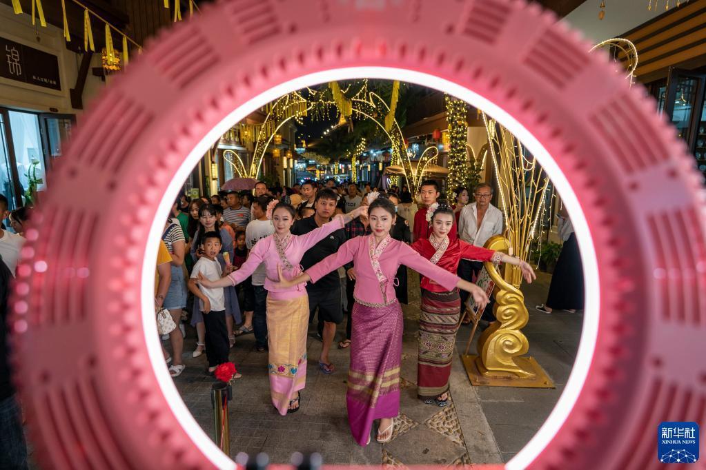 夜になり街の明かりがともる頃、雲南省徳宏タイ族チンポー族自治州芒市のタイ族の町は賑やかになり始める。2022年国家文化・観光部が決定した第2陣国家級夜間文化・観光消費クラスターの1つであるここは、特徴的な少数民族の建築、洋服、踊り、グルメが集まり、観光客を魅了している。
