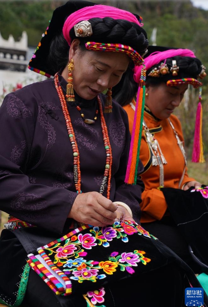 四川省甘孜蔵族自治州丹巴県巴底鎮色足村で、花の刺繍をする嘉絨蔵族刺繍甘孜蔵族自治州無形文化遺産伝承者の阿姆さん(写真左)と弟子の安初さん(10月12日撮影・呂明響)。