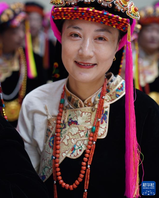 四川省甘孜蔵族自治州丹巴県の県城(県庁所在地)で、地元のイベントに参加する嘉絨蔵族刺繍の伝統衣装を身に着けた女性(10月11日撮影・呂明響)。
