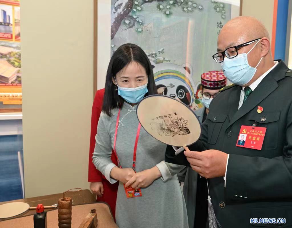 중국 공산당 제20차 전국대표대회(당대회) 대표가 성과전에서 부채를 살펴보고 있다. 제20차 당대회에 참가한 대표들이 17일 저녁 '신시대를 향해 나아가자(奮進新時代)'를 주제로 열린 성과전을 방문했다. 이날 성과전에는 지난 10년 간 중국 당과 국가 사업이 거둔 성과와 발생했던 역사적 변혁들이 전시됐다.