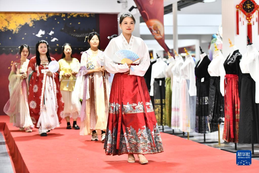 6일 산둥(山東)성 차오(曹)현의 한 한푸(漢服)기지에서 한푸를 입은 라이브 커머스 진행자들이 런웨이를 걷고 있다.