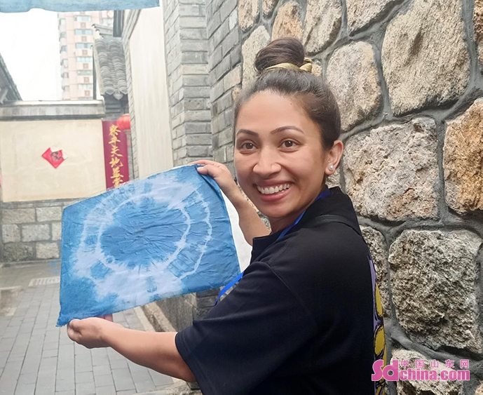 염색체험관에서 염색교사 웨이셴융(魏顯勇)은 외국 친구들에게 완성된 염색예술작품을 전시하고 또 염색절차, 방법과 기교를 상세하게 설명했다. 외국 친구들은 상상력을 충분히 발휘하여 자신이 원하는 패턴의 결에 따라 손에 있는 옷감을 실로 감고, 디자인, 접기, 찔러넣기, 풀빼기, 염색, 세척 등 일련의 단계를 거쳐 염색천을 점차 성형했다. 손수 만든 염색천은 해외 친구들로 하여금 손에서 놓지 못하게 하여, 잇달아 함께 사진을 찍게 했다.