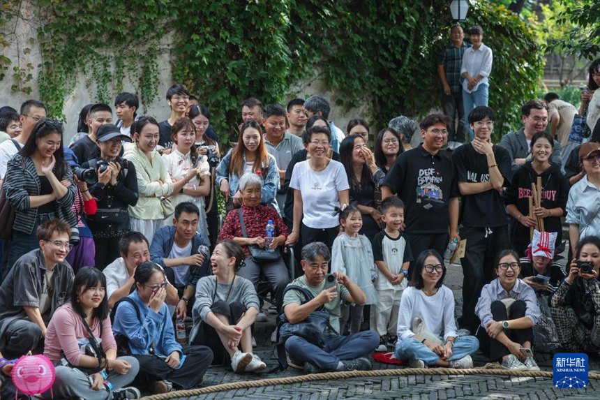 관광객들이 우전 거리에 펼쳐지는 퍼레이드 공연을 구경한다. [10월 17일 촬영/사진 출처: 신화사]