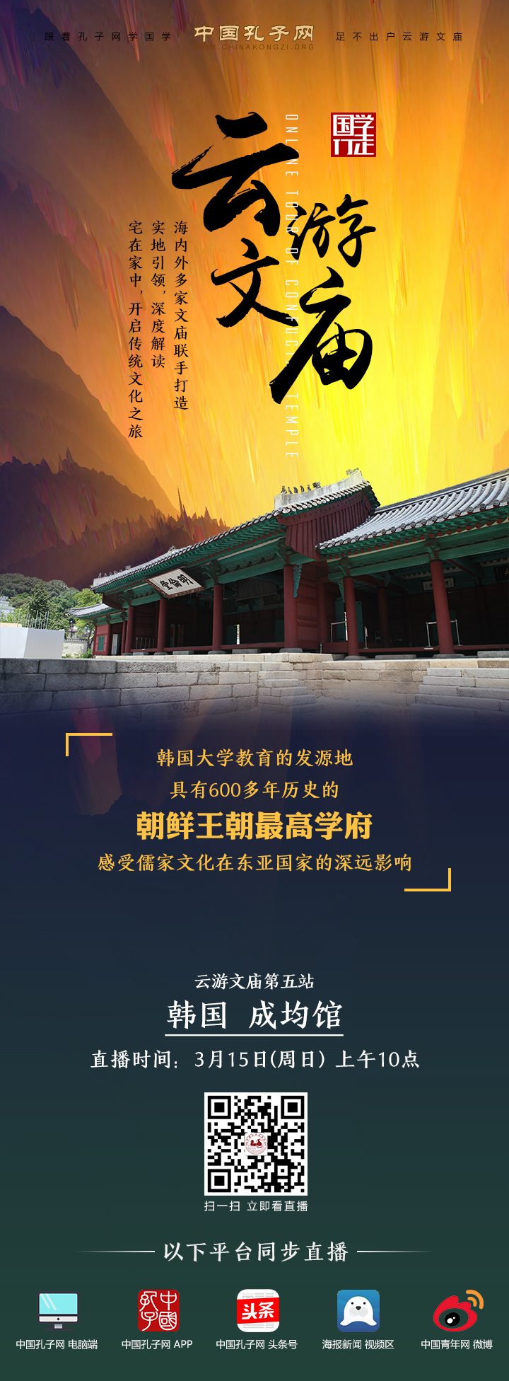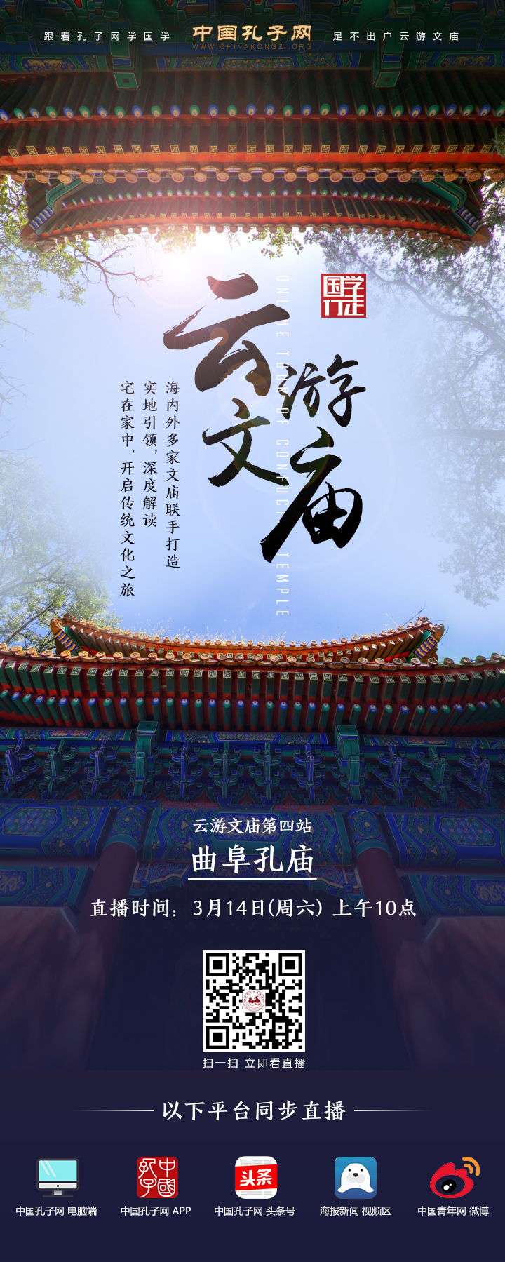 扫描海报二维码关注孔子基金会微博观看直播或在中国孔子网网站、孔子网app、中国孔子网头条号、海报新闻视频区、中国青年网微博 观看直播