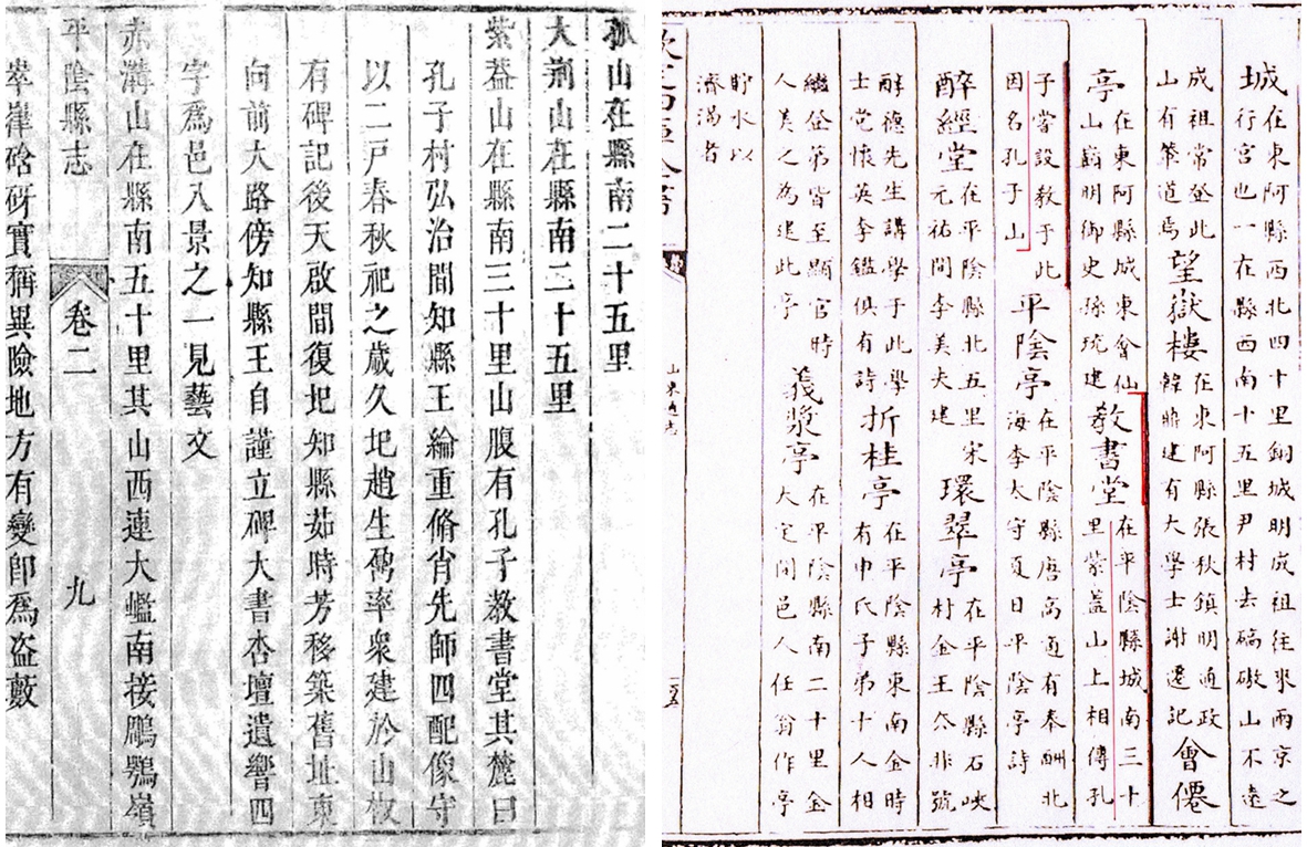 《四库全书》记载:“教书堂,在平阴县城南三十里紫盖山上,相传孔子常设教于此,因名孔子山”。府志云:“此山因孔子设教,命名为孔子山,山下村庄得名孔子村”。