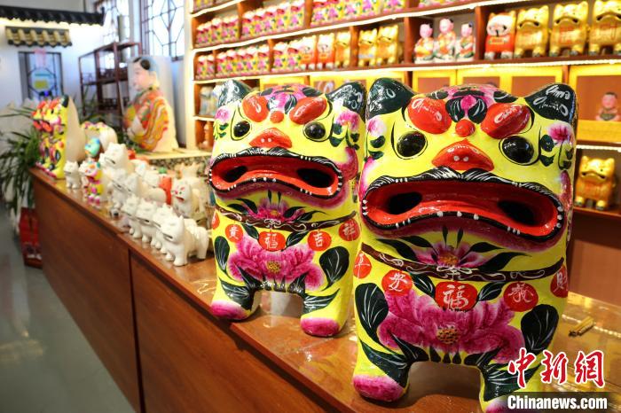 “金虎”胸前写有“日进斗金,八方来财”,“财神虎”头身“混搭”面带喜庆,“五彩虎”融合非遗元素……在聂鹏去年新启用的工作室内,记者初入门厅便看到造型各异、色彩缤纷的“叫虎”。有的高达一米,有的小如拳头,每个都做工精致、惟妙惟肖,“独一无二”。