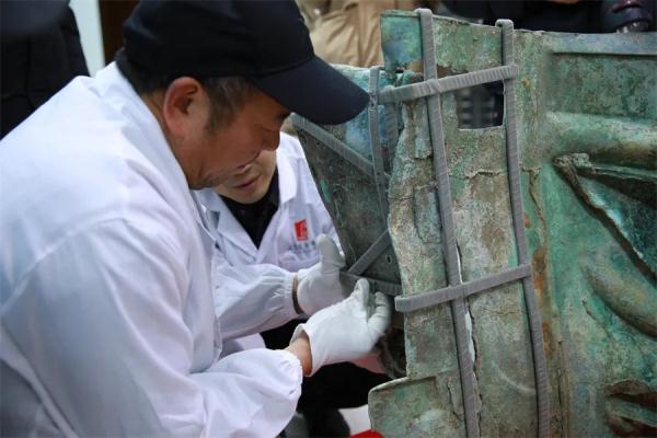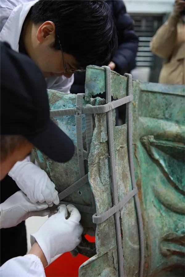 工作人员正在对青铜大面具进行加固。