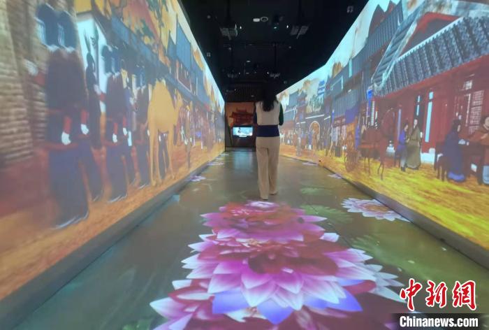 记者跟随工作人员沿着走廊中央一步一步向前走,只见一朵又一朵莲花在地面互动投影技术下随脚步“盛开”,如同“人在画中游”。走廊两侧,两面长约15米、高约3米的展板墙上,工作人员通过运用三维技术设计场景,再现古都晋阳(今太原)街貌。