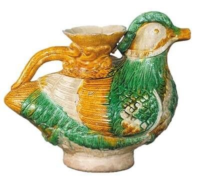 辽三彩是受唐三彩影响而创烧的低温彩色釉陶制品,多用黄、白、绿三色釉,有人称其为草原色。“这件鸳鸯壶是辽三彩的代表作,出土于松山区王家店乡辽墓。”讲解员说。壶体饰黄、白、绿三彩,圈足处无釉;整体造型如一只鸳鸯浮在水中,背上有一个五瓣花形注水口,口后部有一弧形提梁与尾部相连,鸳鸯的喙部做成壶嘴。这件三彩壶构思巧妙,羽翼线条刻画生动流畅,堪称艺术精品。