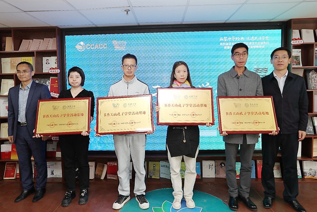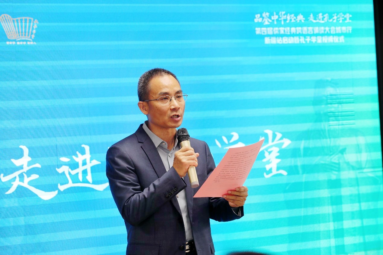 中国孔子基金会孔子学堂推进委员会副主任孙润来宣读了关于成立书香天山科技有限公司孔子学堂的批复函,并与韬奋基金会阅读组织联合会理事、新疆书香天山文化科技有限公司党组织书记、总经理韩芝雄、全民阅读推广人、全国十佳播音主持教师、新疆书香天山科技有限公司副总经理、书香天山科技有限公司孔子学堂负责人何志涓共同为孔子学堂揭牌。