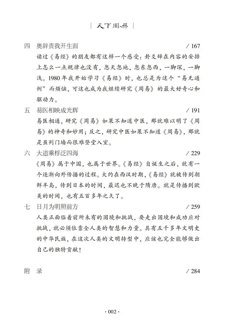 三、在面向未来的时间坐标轴上,作者视野宏阔,目光如炬,深刻阐述《周易》应对危机的独特价值。作者认为《周易》实际上就是一门如何生存和发展的学问,是一部指导人们趋吉避凶、兴利除害的宝典。面对人类社会进入21世纪后面临的困境和挑战,作者从借鉴《周易》智慧处理好人与自然、人与人、人与自身三种关系的角度予以积极乐观应对,认为……提出的推动构建人类命运共同体理念,为人类迎接挑战、走出危机贡献了中国智慧和中国方案。