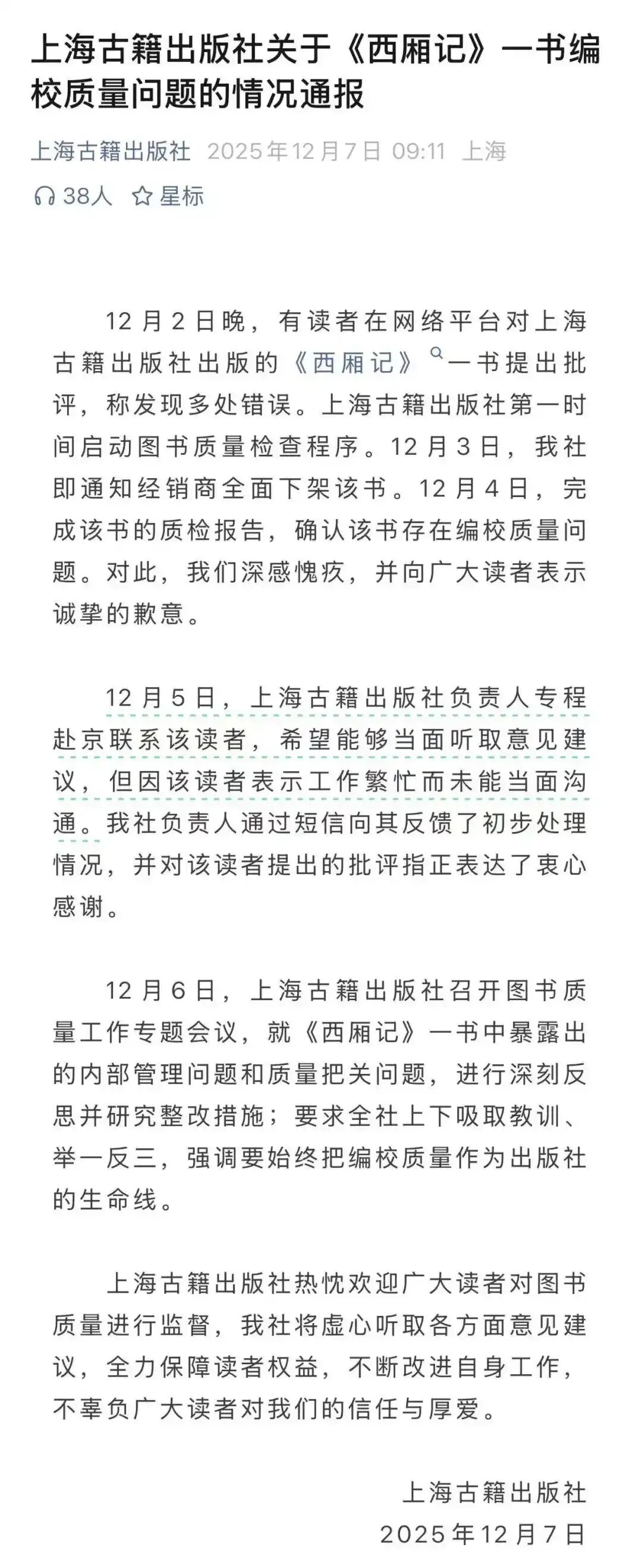 值得肯定的是,两家出版社在事发后都迅速作出了回应:上海古籍出版社通知经销商全面下架问题《西厢记》,完成质检报告并致歉;中华书局也对《世说新语(中学生版)》启动下架处理。但道歉和下架只是第一步,更重要的是行业层面的深刻反思和长效整改。