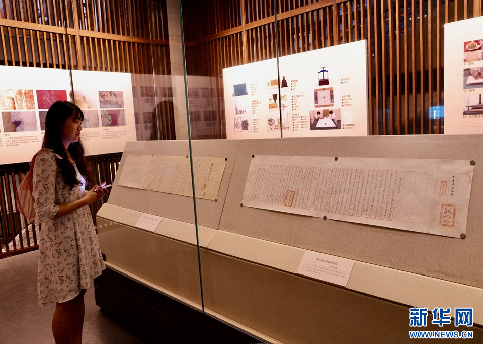 在“孔府档案(第一批)本体保护修复成果展”展厅,游客参观“至圣庙乐舞童试卷”。新华网发(侯新建 摄)
