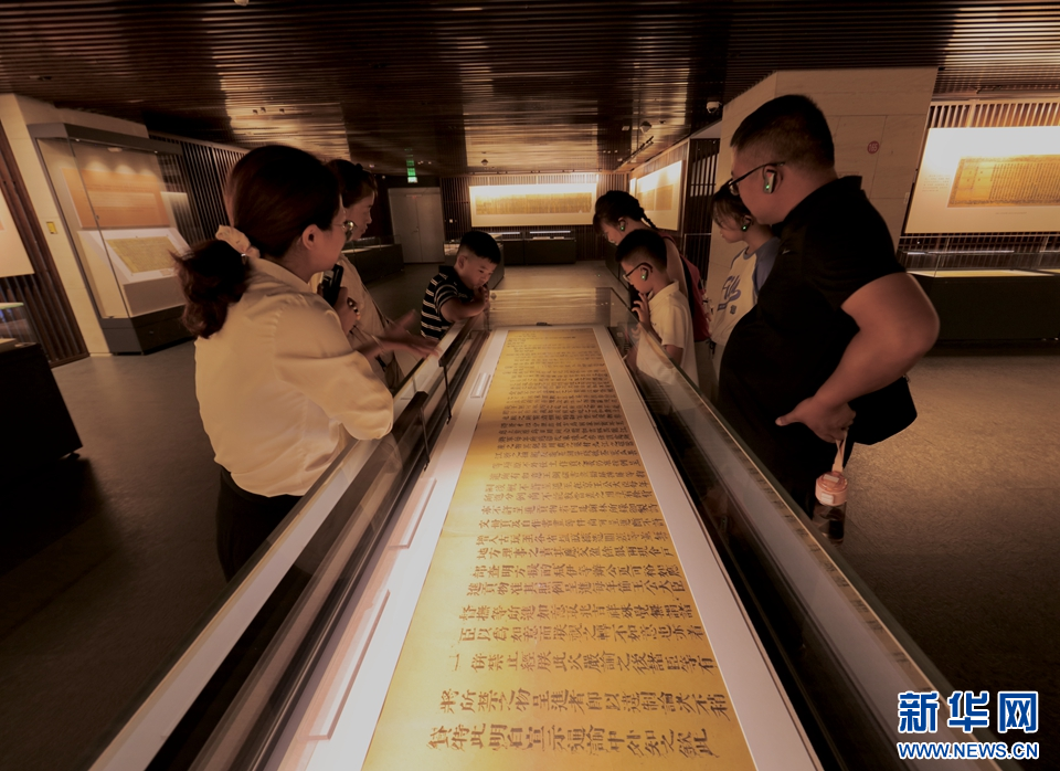 在“持廉秉公——孔府旧藏‘誊黄’撷英展”展厅,游客在观看清嘉庆帝以和珅案为例告诫内外大臣严禁呈进贡物的誊黄。新华网发(侯新建 摄)