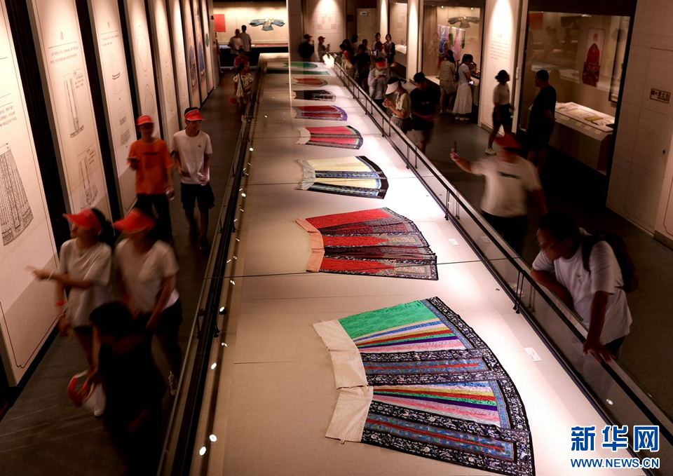 在“她·世界——孔府女性生活图景展”展厅,观众在参观孔府旧藏清代镀金点翠凤冠、彩绣仙鹤方补霞帔、绣花飘带垂穗云肩。新华网发(侯新建 摄)