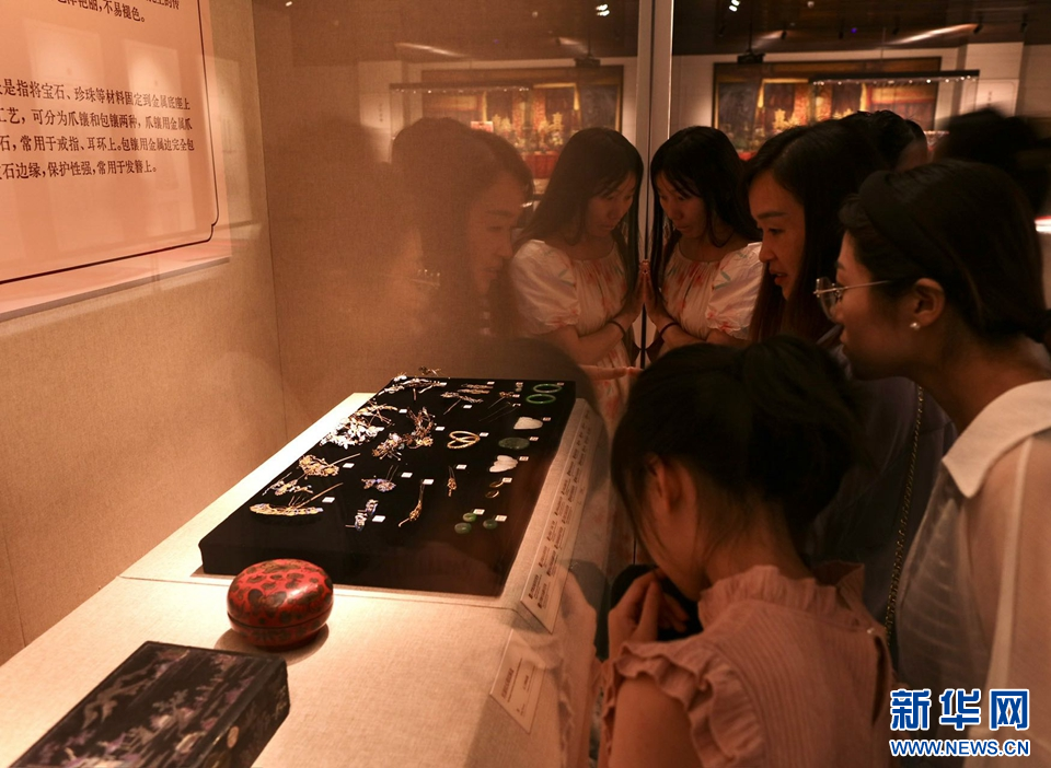 在“她·世界——孔府女性生活图景展”展厅,观众在参观孔府旧藏金银发饰、发簪、发钗、耳环及手饰等。新华网发(侯新建 摄)