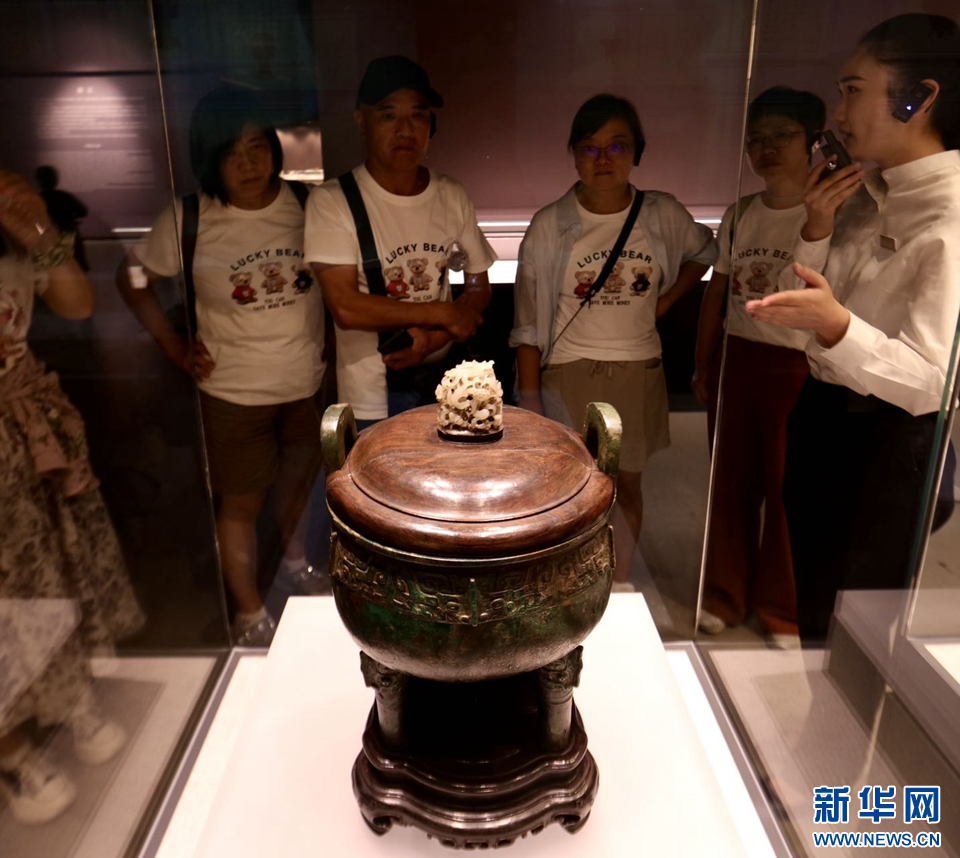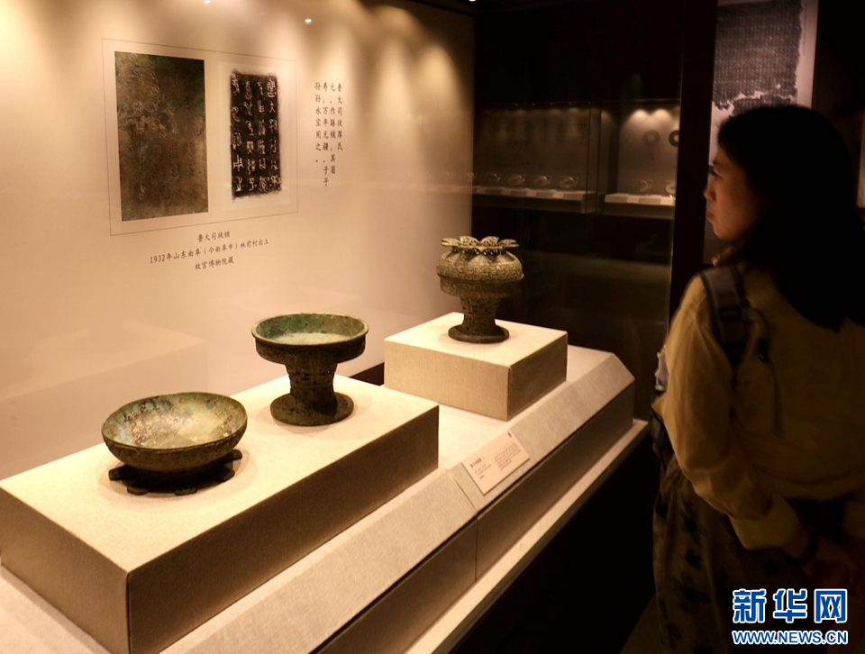 在“大道之行——儒家文化特展”展厅,观众在参观孔府珍藏御赐商周十供之一的商代“木工册”款兽面纹铜鼎。新华网发(侯新建 摄)