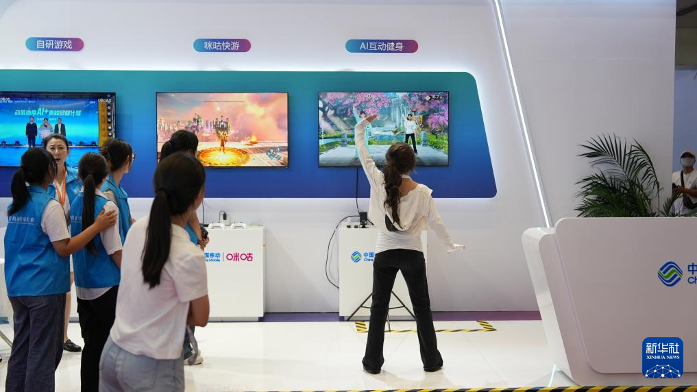8月28日,观众在博览会上体验AI互动项目。新华社记者 杨静 摄