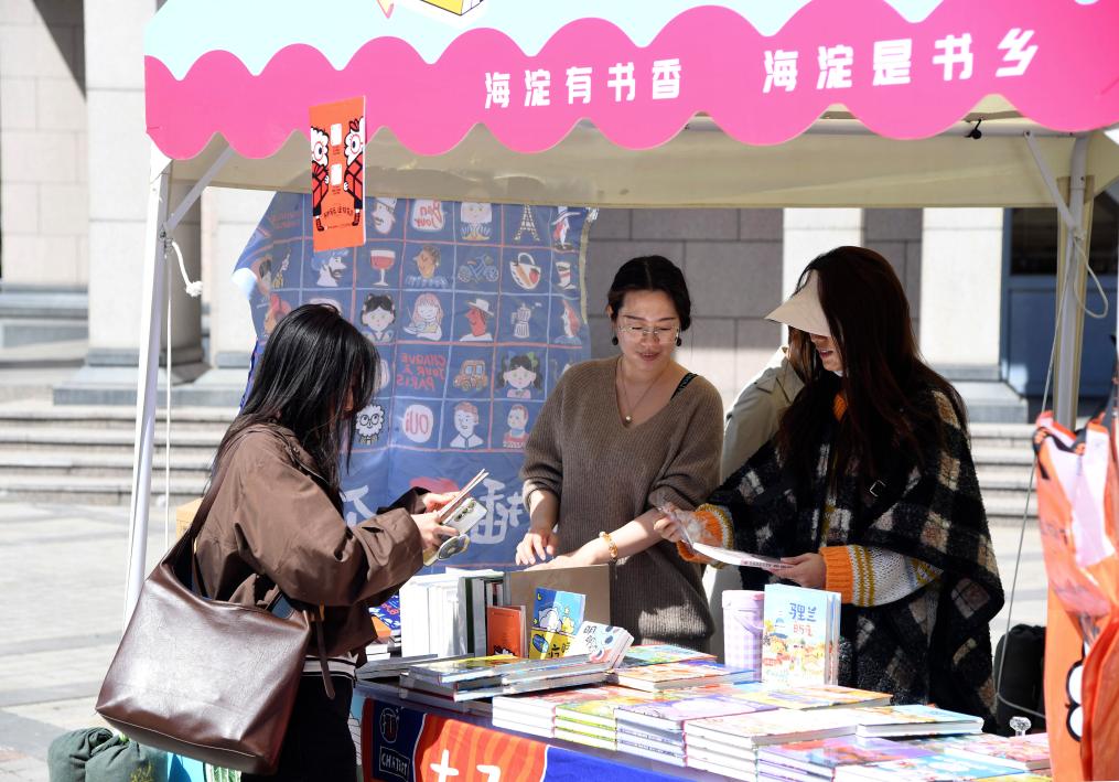 4月20日,在北京大学,学生(左)在“旧书新知·读书育人”活动现场挑选图书。 新华社记者 任超 摄