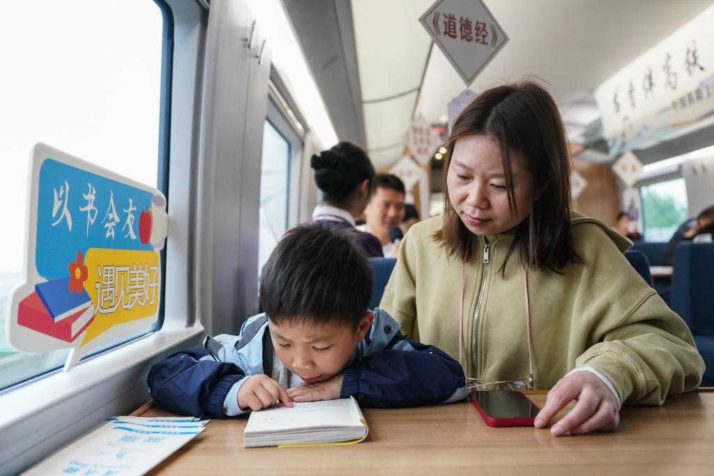 4月20日,一名小旅客在G7378次列车上举行的“书香伴高铁 阅读润旅途”列车阅读会上阅读。 新华社记者 杜宇 摄