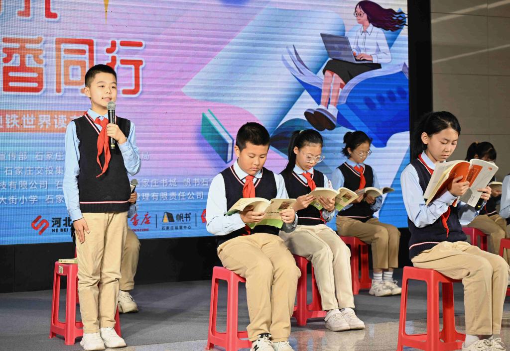 19日、河北省の石家荘市図書館が開いたイベントで本を朗読する子ども。(石家荘=新華社配信/陳其保)