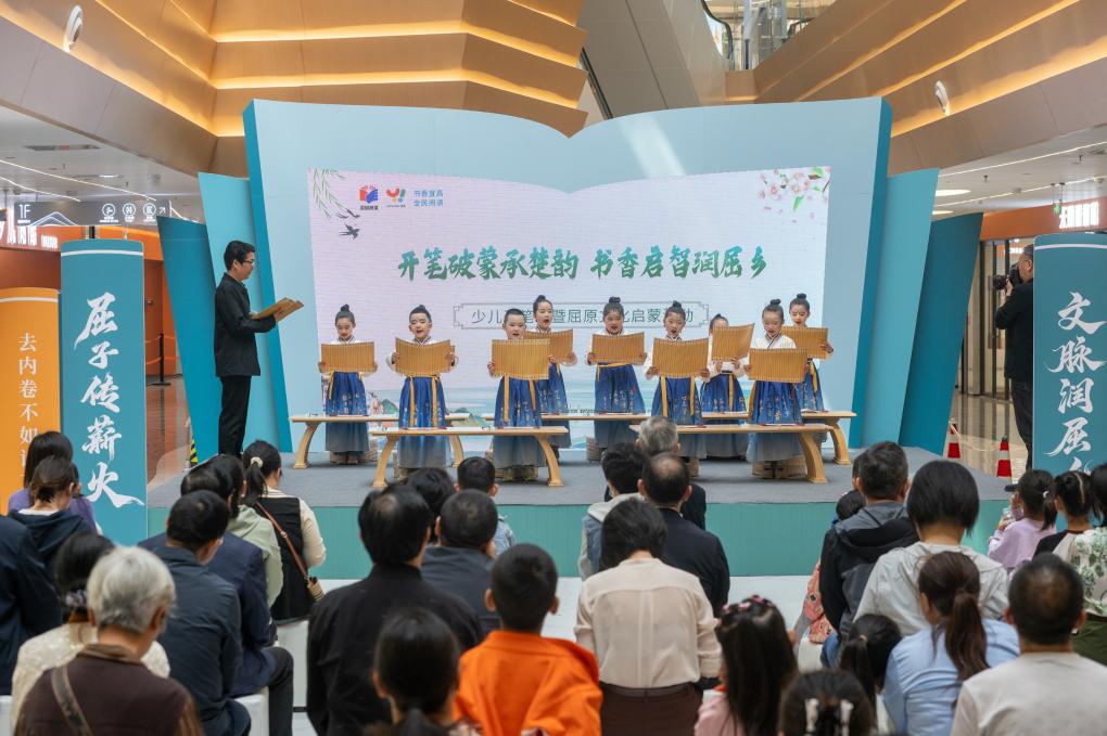19日、湖北省宜昌市秭帰(しき)県の天問書城で本を朗読する子どもたち。(宜昌=新華社配信/雷勇)