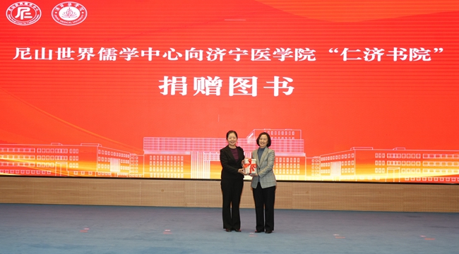 国承彦、卢国华等与会嘉宾为济宁医学院“仁济书院”揭牌。尼山世界儒学中心向济宁医学院“仁济书院”赠送传统文化书籍。刘宝之、王超分别向尼山世界儒学中心和济宁医学院赠送墨宝。