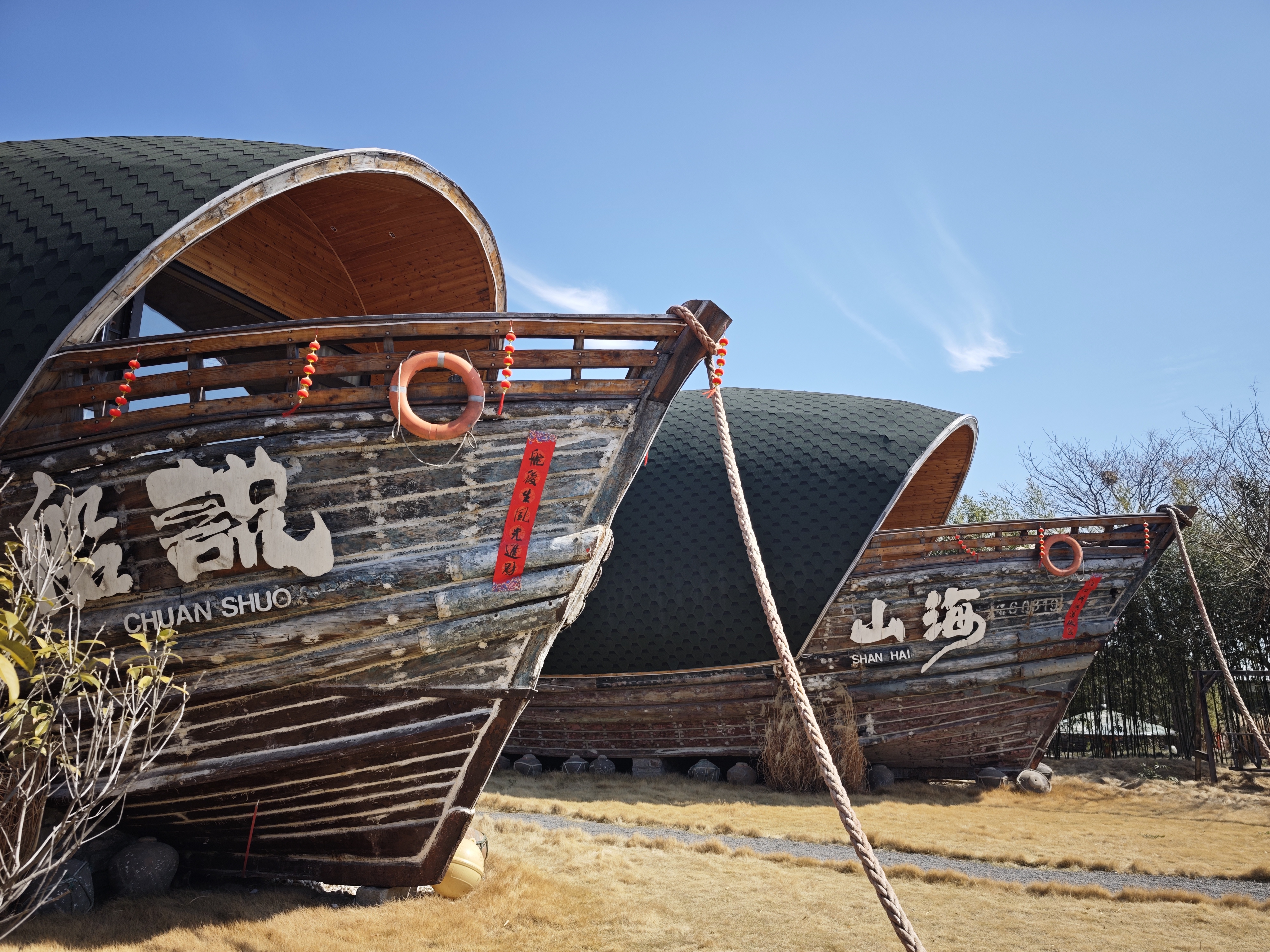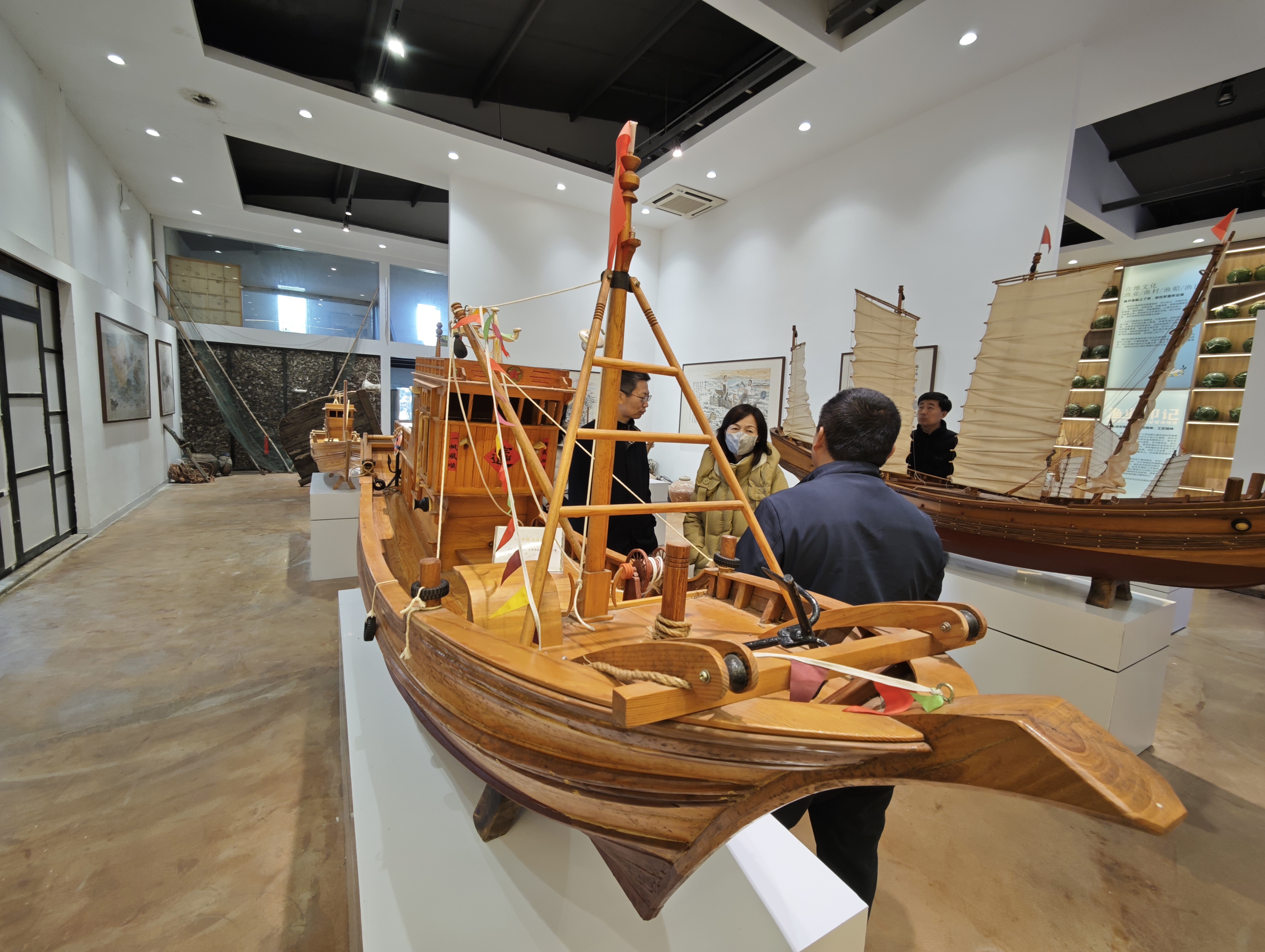 ▲游客在日照市的海洋主题民宿欣赏体验传统渔船制造技艺