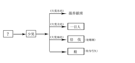 有关少昊之世系,可见《大荒北经》:“有人一目,当面中生,一曰是威姓,少昊之子,食黍”。又见《大荒南经》:“有缗渊,少昊生倍伐,倍伐降处缗渊。有水四方,名曰俊坛”。再见《海内经》:“少昊生般,般是始为弓矢”。如此南北中又都有少昊之子所居之地,若为史证,则少昊又南北中而分矣。居此可得少昊世系: