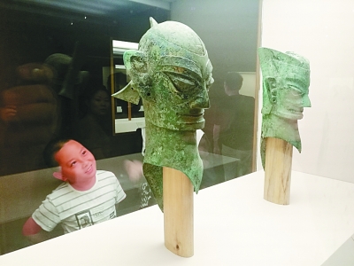 一位小观众对国家博物馆“古蜀华章展”中的青铜头像产生了兴趣。光明日报记者李韵摄/光明图片