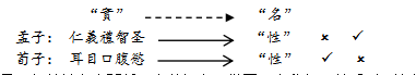 这是一个基于名实关係而有的视角。从图示中我们可以看到,较之传统的维度和理路,新的维度和理路的不同之处就是前后次序有了一个完全的反转,而这种反转,并非是一个逻辑上的安排,而实乃是对历史及事实的回归与还原。因为从“名”与“实”之现实而真实的关係看,绝非是先有“名”而后有“实”,而是相反,是先有“实”之存在,然后人才“随而命之”[《荀子·正名》]。对孟子和荀子来说,实际的情形当然也是如此。“仁义礼智圣”和“耳目口腹慾”作为“实”,原本存在,在先,是前提;而二人所谓“性”作为“名”或概念,乃人之所命,在后,是结果。由“实”而“名”,这是一个事实上的、本然的顺序和过程,因此,相对于传统的维度和理路而言,我们透过新的视角而达成的首先是一个逻辑与历史的真正一致或统一。