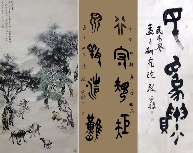 孟子研究院殷延禄同志的两幅书法作品蕴涵丰富,《民为贵》意涵把人民的利益放在第一位,充分体现了中国共产党人的初心和使命。《行守规矩气养浩然》意涵党员干部一言一行都应遵纪守规、廉洁从政,养成浩然正气。两幅作品采用大篆书写,笔力遒劲、厚重稳健,既有沉雄峻逸之势,又有浑穆古拙之风。