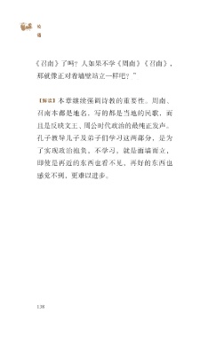 ? 论 语 《召南》了吗?人如果不学《周南》《召南》, 那就像正对着墙壁站立一样吧?” 【解读】本章继续强调诗教的重要性。周南、 召南本都是地名,写的都是当地的民歌,而 且是反映文王、周公时代政治的最纯正发声。 孔子教导儿子及弟子们学习这两部分,是为 了实现政治抱负,不学习,就是面墙而立, 即使是再近的东西也看不见,再好的东西也 感觉不到,更难以进步。 138