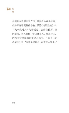 ?论 语 他们外表看似庄正严厉,其实内心虚伪怯懦, 就像那穿墙爬洞的小偷。邢昺《论语注疏》曰: “此章疾时人体与情反也。言外自矜厉,而 内柔佞,为人如此,譬之犹小人,外虽持正, 内常有穿壁窬墙窃盗之心也与。”朱熹《论 语集注》曰:“言其无实盗名,而常畏人知也。” 142