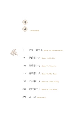 目 录 Contents 1 卫灵公第十五? Book 15. Wei Ling Kun 72 季氏第十六? Book 16. Ke She 113 阳货第十七? Book 17. Yang Ho 171 微子第十八? Book 18. Wei Tsze 203 子张第十九? Book 19. Tsze-chang 259 尧曰第二十? Book 20. Yao Yueh 275 后? 记?Afterword