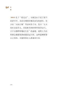?论 语 【解读】孔子“欲无言”,大概是由于说了话当 政者不听、无法实现政治抱负而发的感叹。至 于以“天何言哉”等语回答子贡,是以“上天 没有言说什么,春夏秋冬四时照样循序运行, 天下百物照样循时生长”的道理,说明人与自 然都会遵循规律而前进运行的。这种道理要靠 自己领悟,不能事事让人教诲和引导。 154