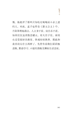 阳 货 第 十 七 慨,他批评了那些只知吃吃喝喝而不求上进 的人。对此,孟子也曾在《滕文公上》中, 言辞犀利地指出,人立身于世,应自求于道, 如果仅仅追求饱食暖衣,有大房子住,而没 有接受很好的教育,体现好的教养,那就和 禽兽没有什么两样了。先贤告诉我们要积极 进取,勤奋学习,不能有消极无聊的生活态度。 161