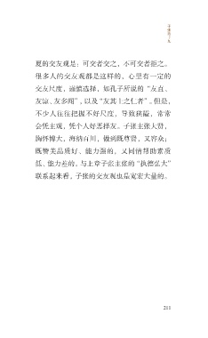 子 张 第 十 九 夏的交友观是:可交者交之,不可交者拒之。 很多人的交友观都是这样的,心里有一定的 交友尺度,谨慎选择,如孔子所说的“友直、 友谅、友多闻”,以及“友其士之仁者”。但是, 不少人往往把握不好尺度,导致狭隘,常常 会凭主观,凭个人好恶择友。子张主张大贤, 胸怀博大,海纳百川,做到既尊贤,又容众; 既赞美品质好、能力强的,又同情帮助素质 低、能力差的。与上章子张主张的“执德弘大” 联系起来看,子张的交友观也是宽宏大量的。 211