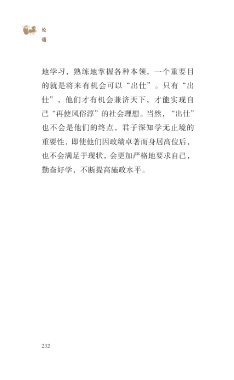 ?论 语 地学习,熟练地掌握各种本领,一个重要目 的就是将来有机会可以“出仕”。只有“出 仕”,他们才有机会兼济天下,才能实现自 己“再使风俗淳”的社会理想。当然,“出仕” 也不会是他们的终点,君子深知学无止境的 重要性,即使他们因政绩卓著而身居高位后, 也不会满足于现状,会更加严格地要求自己, 勤奋好学,不断提高施政水平。 232