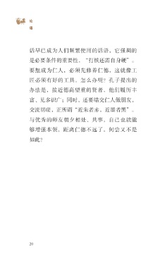 ?论 语 话早已成为人们频繁使用的话语,它强调的 是必要条件的重要性,“打铁还需自身硬”。 要想成为仁人,必须先修养仁德,这就像工 匠必须有好的工具。怎么办呢?孔子提出的 办法是,接近德高望重的贤者,他们履历丰 富、见多识广;同时,还要结交仁人做朋友, 交流切磋,正所谓“近朱者赤,近墨者黑”。 与优秀的师友朝夕相处、共事,自己也就能 够增强本领,距离仁德不远了。何尝又不是 如此? 20