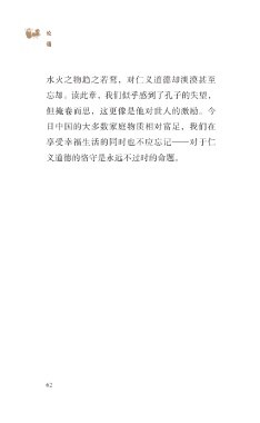 ?论 语 水火之物趋之若鹜,对仁义道德却淡漠甚至 忘却。读此章,我们似乎感到了孔子的失望, 但掩卷而思,这更像是他对世人的激励。今 日中国的大多数家庭物质相对富足,我们在 享受幸福生活的同时也不应忘记——对于仁 义道德的恪守是永远不过时的命题。 62
