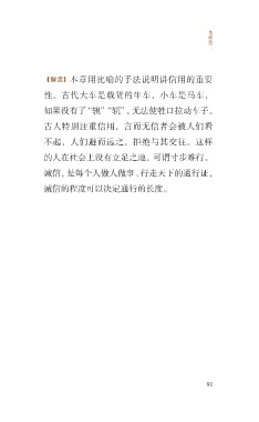 为 政 第 二 【解读】本章用比喻的手法说明讲信用的重要 性。古代大车是载货的牛车,小车是马车, 如果没有了“ ”“ ”,无法使牲口拉动车子。 古人特别注重信用,言而无信者会被人们看 不起,人们避而远之,拒绝与其交往。这样 的人在社会上没有立足之地,可谓寸步难行。 诚信,是每个人做人做事、行走天下的通行证, 诚信的程度可以决定通行的长度。 91