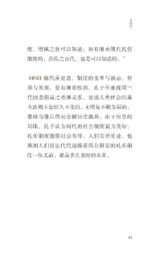 为 政 第 二 度,增减之处可以知道;如有继承周代礼仪 制度的,虽传之百代,也是可以知道的。” 【解读】朝代虽更迭,制度的变革与损益,传 承与发展,是有继承性的。孔子举夏商周三 代因袭损益之承继关系,是说人类社会的基 本法则不是恒久不变的。文明是不断发展的, 愚昧与落后终究会被历史抛弃。由于历史的 局限,孔子认为周代的社会制度最为美好, 礼乐制度能使社会有序,人们安居乐业。他 预测人们世世代代遵循着周公制定的礼乐制 度一往无前,那是多么美好的未来。 93
