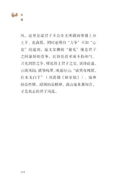 ?论 语 风,这里是说君子不会在无所谓的事情上分 上下、比高低。同时还明白“力争”不如“心 竞”的道理,温文尔雅的“射礼”便是君子 之间最好的竞争,比的是技术而不伤和气。 刀光剑影之争,哪比得上君子之交。谈诗论道, 云淡风轻;鼓筝鸣琴,响遏行云;“谈笑有鸿儒, 往来无白丁”(刘禹锡《陋室铭》)。濡养 的是性情,浸润的是精神,高山流水遇知音, 才是真正的君子风范。 114