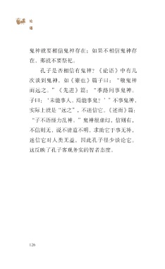 ?论 语 鬼神就要相信鬼神存在;如果不相信鬼神存 在,那就不要祭祀。 孔子是否相信有鬼神?《论语》中有几 次谈到鬼神,如《雍也》篇子曰:“敬鬼神 而 远 之。”《 先 进 》 篇:“ 季 路 问 事 鬼 神。 子曰:‘未能事人,焉能事鬼?’”不事鬼神, 实际上就是“远之”,不迷信它。《述而》篇: “子不语怪力乱神。”鬼神很虚幻,信则有, 不信则无,说不清道不明,求助它于事无补, 迷信它对人类无益,因此孔子很少谈论它。 这反映了孔子客观务实的智者态度。 126